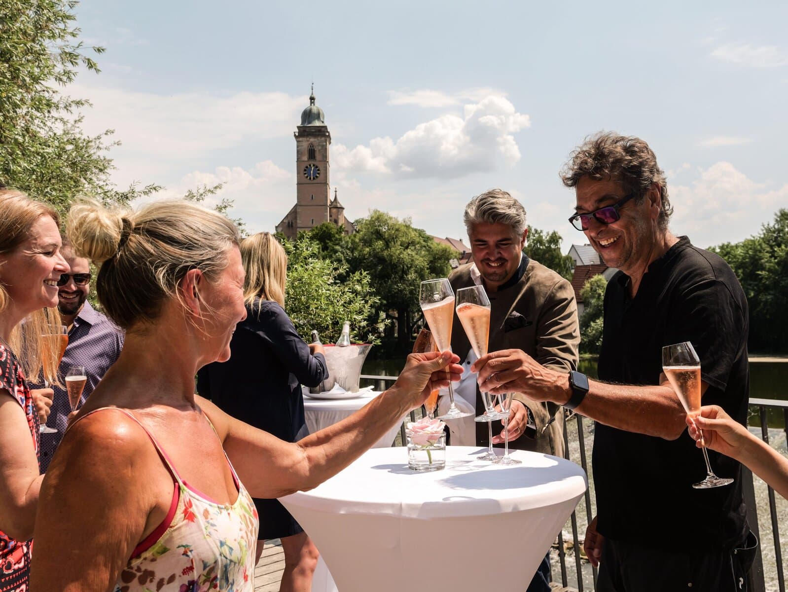 Gäste genießen Sekt bei sonnigem Wetter in Nürtingen